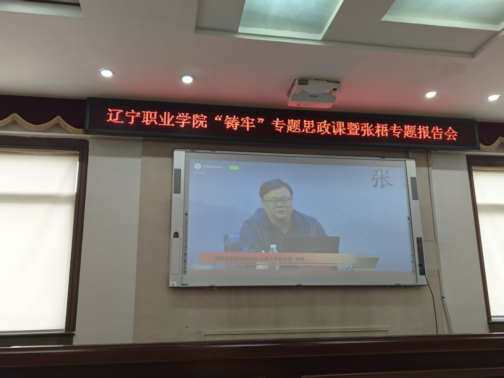此次專題思政課,劉詩宇老師在現場作專題教學,帶領學生線上云參觀遼寧省博物館的“山海共融和合共生——遼寧省鑄牢中華民族共同體意識主題展”。線上依托遼寧省教育廳邀請北京大學哲學系研究員張梧作專題報告,從中華文明看中華民族共同體,明確中華民族共同體是人心所向、大勢所趨、歷史必然。