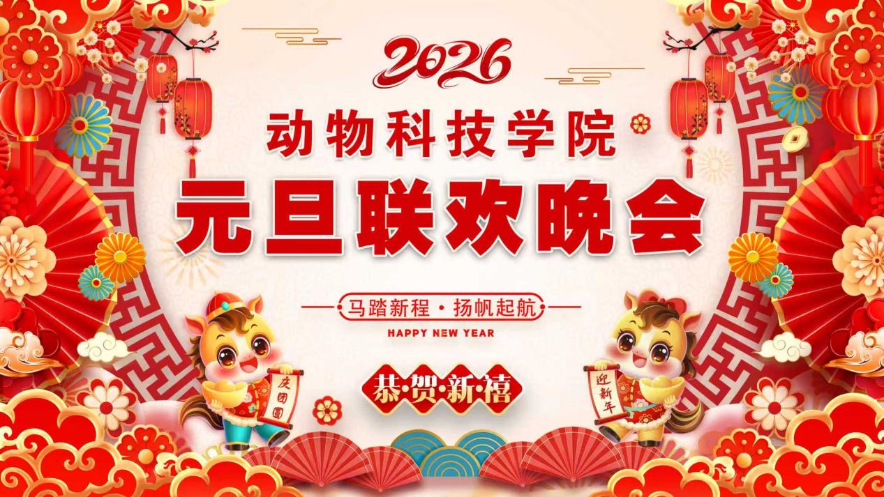 凱歌奏響,共辭舊歲;豪情激蕩,喜迎新年。在深入學習貫徹黨的二十大及黨的二十屆四中全會精神、奮力譜寫教育強國建設新篇章的時代背景下,為進一步弘揚中華美育精神,充分展現新時代師生昂揚向上的精神風貌和堅定文化自信,值此辭舊迎新之際,動物科技學院于2025年12月29日晚隆重舉辦以“?馬踏新程,揚帆起航?為主題的師生元旦文藝晚會。學院各部門領導與全體師生共聚一堂,在喜慶祥和、熱烈昂揚的濃厚氛圍中,共同回首奮斗歷程,展望發展愿景,迎接充滿希望的2026年。